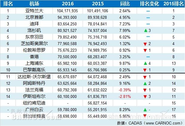 2016全球最大機(jī)場排名TOP10 上海浦東入榜