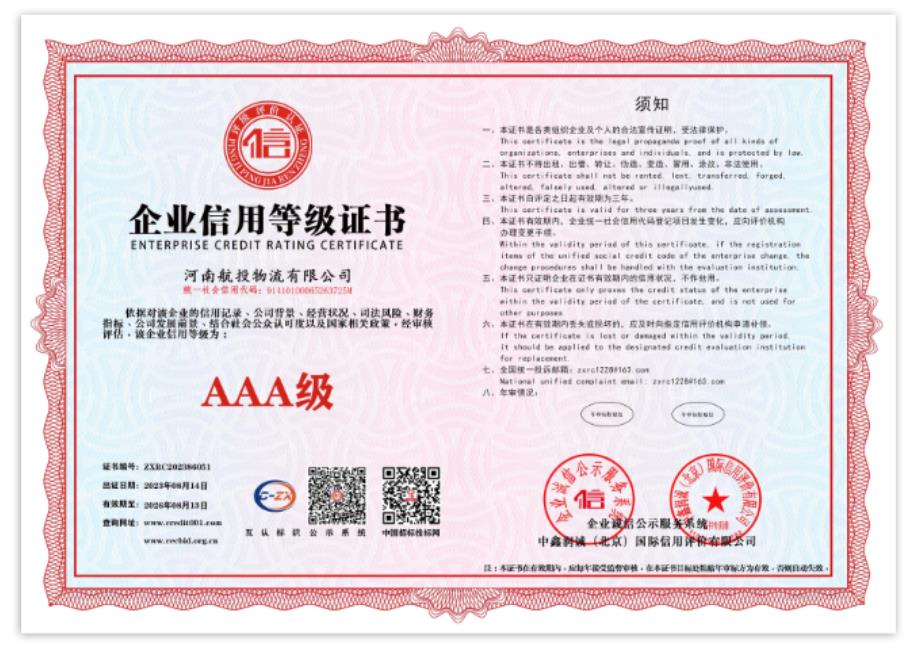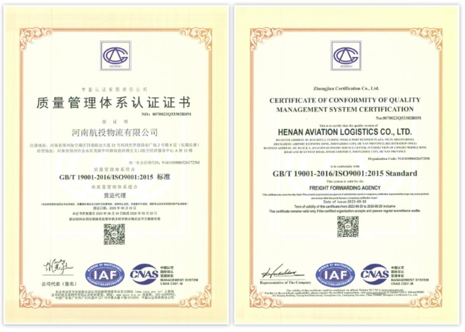 近日,航投物流通過GB/T 19001-2016/ISO 9001:2015質(zhì)量管理體系認(rèn)證審核,榮獲ISO質(zhì)量管理體系認(rèn)證證書,同時(shí)獲得了企業(yè)信用的最高評(píng)定——AAA級(jí)企業(yè)信用等級(jí)證書,被授予“十證一牌”。喜獲雙重肯定,意味著航投物流在行業(yè)綜合競(jìng)爭(zhēng)中邁上新臺(tái)階,是對(duì)其高效業(yè)務(wù)流程、標(biāo)準(zhǔn)化經(jīng)營(yíng)、規(guī)范化管理模式的肯定。