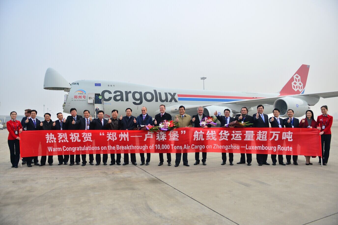 為慶祝洲際新航線的喜人佳績(jī),鄭、盧兩地均舉行了簡(jiǎn)單而熱烈的紀(jì)念活動(dòng)。當(dāng)?shù)貢r(shí)間22日下午5點(diǎn),在芬德?tīng)枡C(jī)場(chǎng)舉行了“貨運(yùn)超萬(wàn)噸航班起航儀式”,盧森堡可持續(xù)發(fā)展與基礎(chǔ)產(chǎn)業(yè)部部長(zhǎng)弗朗索瓦?鮑施、中國(guó)駐盧森堡大使曾憲柒以及盧貨航董事會(huì)主席保羅?海明格、CEO德克?李奇、高級(jí)副總裁兼財(cái)務(wù)總監(jiān)理查德?福森參加。之后,保羅?海明格、德克?李奇、理查德?福森特意搭乘“鄭州號(hào)”飛抵鄭州,參加中方23日下午舉行的“貨運(yùn)超萬(wàn)噸航班接機(jī)儀式”。