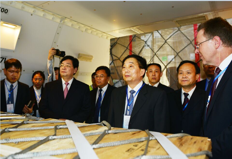 出席盧貨航45周年慶祝儀式的有河南省副省長李亞、省長助理安惠元、省政府副秘書長馬剛。河南航投董事長、黨委書記張明超,總經(jīng)理、副董事長、黨委副書記劉建葆,公司領(lǐng)導班子其他成員及相關(guān)業(yè)務負責人參加了慶祝儀式。適逢盧貨航2015年全球經(jīng)理人大會在鄭州召開,前來參會的50多位來自全球各個地區(qū)的區(qū)域經(jīng)理和重要部門負責人與中方人員一起,在鄭州機場見證了這一具有歷史意義的時刻。現(xiàn)場工作人員向機組人員獻上鮮花,隨后,雙方代表登機視察。