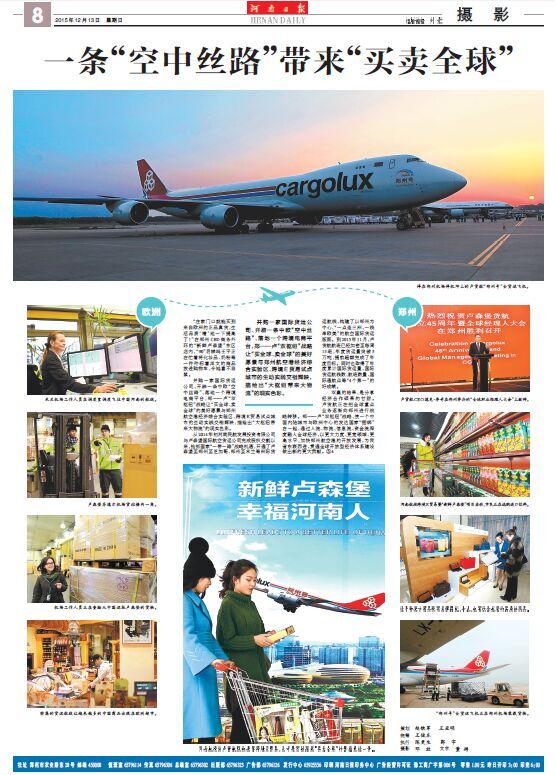 在8次報(bào)道中,既有會(huì)前的“熱身”宣傳,又有會(huì)中的集中點(diǎn)擊,還有會(huì)后的回顧追蹤,形成系列,精彩紛呈。13日,《河南日?qǐng)?bào)》以圖文并茂的整版篇幅,對(duì)河南航投與盧貨航的合作,尤其是“新鮮盧森堡”雙向跨境E貿(mào)易進(jìn)行了詳細(xì)報(bào)道。整個(gè)報(bào)道以新聞攝影為主,既有盧貨航“鄭州號(hào)”波音747-8F全貨機(jī),也有鄭-盧航線的專業(yè)操作流程展示,還有河南百姓采購(gòu)“新鮮盧森堡”商品的真實(shí)場(chǎng)景……以鄭盧“雙樞紐”為典型案例,圍繞“一條‘空中絲路’帶來(lái)‘買賣全球’”這一主題,生動(dòng)展現(xiàn)了河南省依靠藍(lán)天對(duì)外開(kāi)放的新思路和新成就。