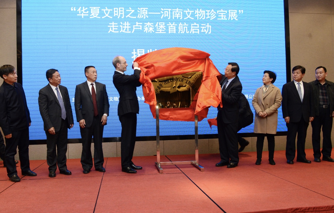 河南省政協(xié)副主席高體健,盧森堡駐華大使俞博生,河南省文物局局長田凱及河南航投總經(jīng)理、黨委副書記、副董事長劉建葆,副總經(jīng)理郭艷紅等出席儀式。高體健、俞博生、劉建葆分別致辭。高體健和俞博生共同為啟動(dòng)儀式揭牌。