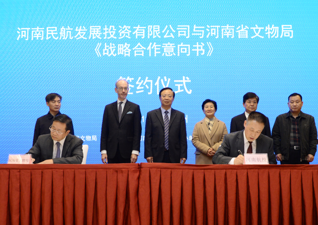 為進(jìn)一步擴(kuò)大雙方合作范圍,儀式最后雙方進(jìn)行了簽約。劉建葆與田凱分別代表河南航投與河南省文物局簽署合作意向書,約定雙方將充分發(fā)揮各自優(yōu)勢(shì),積極落實(shí)省政府《鄭州-盧森堡“空中絲綢之路”建設(shè)專項(xiàng)規(guī)劃(2017-2025)》,提升豫歐文化交流水平,促進(jìn)兩地民心相通。